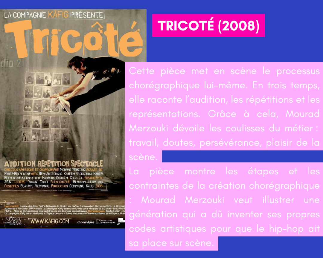 Mourad Merzouki explore ainsi une nouvelle manière de construire une œuvre, où le corps dialogue avec les mots, avec une histoire et une dramaturgie. Cette recherche se prolongera dans d’autres projets comme L’Âge d’or (2006) ou Jojo au bord du monde (2008).